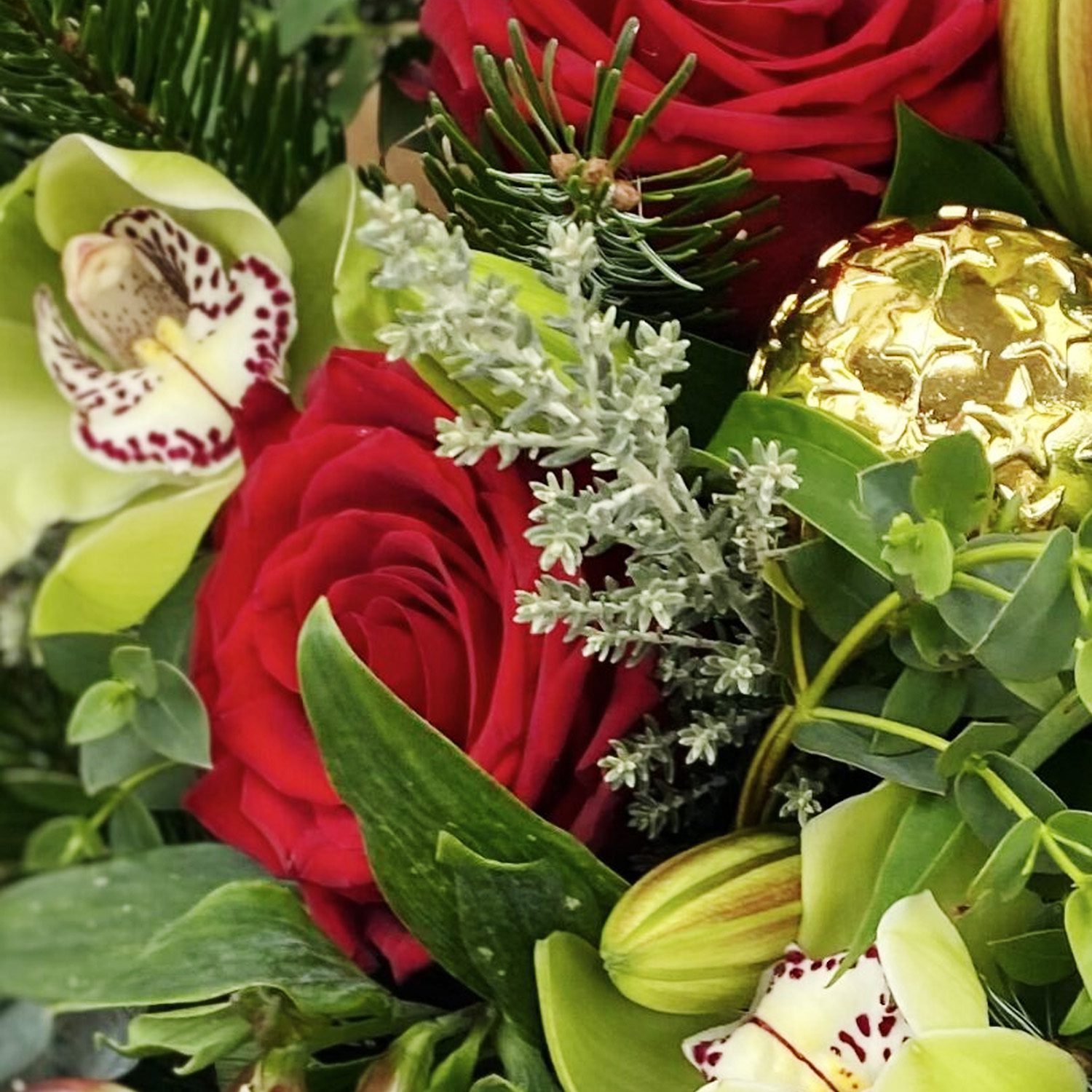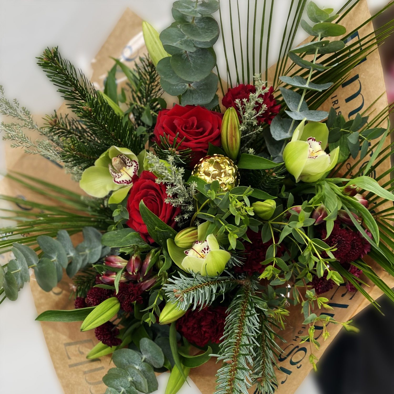 Packed with a merry mix of red and white seasonal blooms and lush green foliage, this bouquet doesn’t just make a statement — it sings carols. Expect a dazzling combo of lilies, elegant cymbidium flowers, classic roses, cheerful carnations, alstroemeria, chrysanthemums, stylish roebelini leaves, and a sparkly Christmas bobble to top it all off.