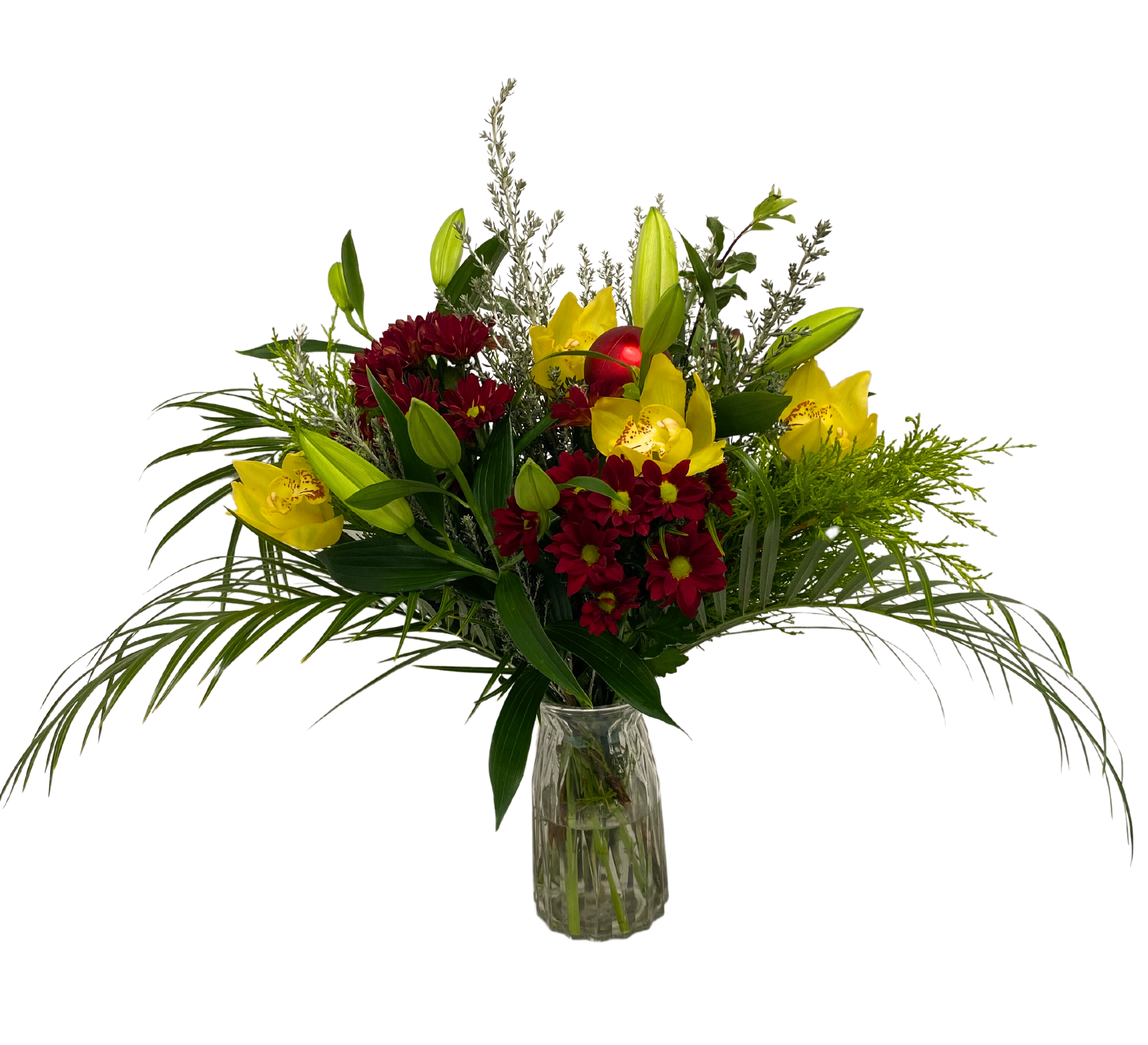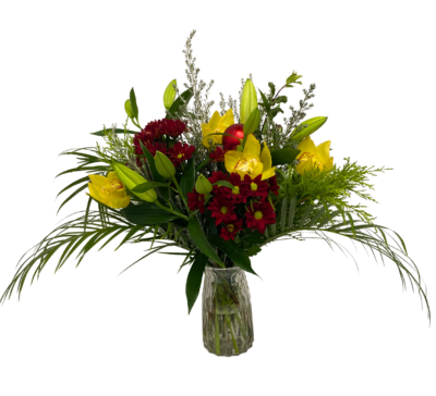 Packed with a merry mix of red and white seasonal blooms and lush green foliage, this bouquet doesn’t just make a statement — it sings carols. Expect a dazzling combo of lilies, elegant cymbidium flowers, classic roses, cheerful carnations, alstroemeria, chrysanthemums, stylish roebelini leaves, and a sparkly Christmas bobble to top it all off.