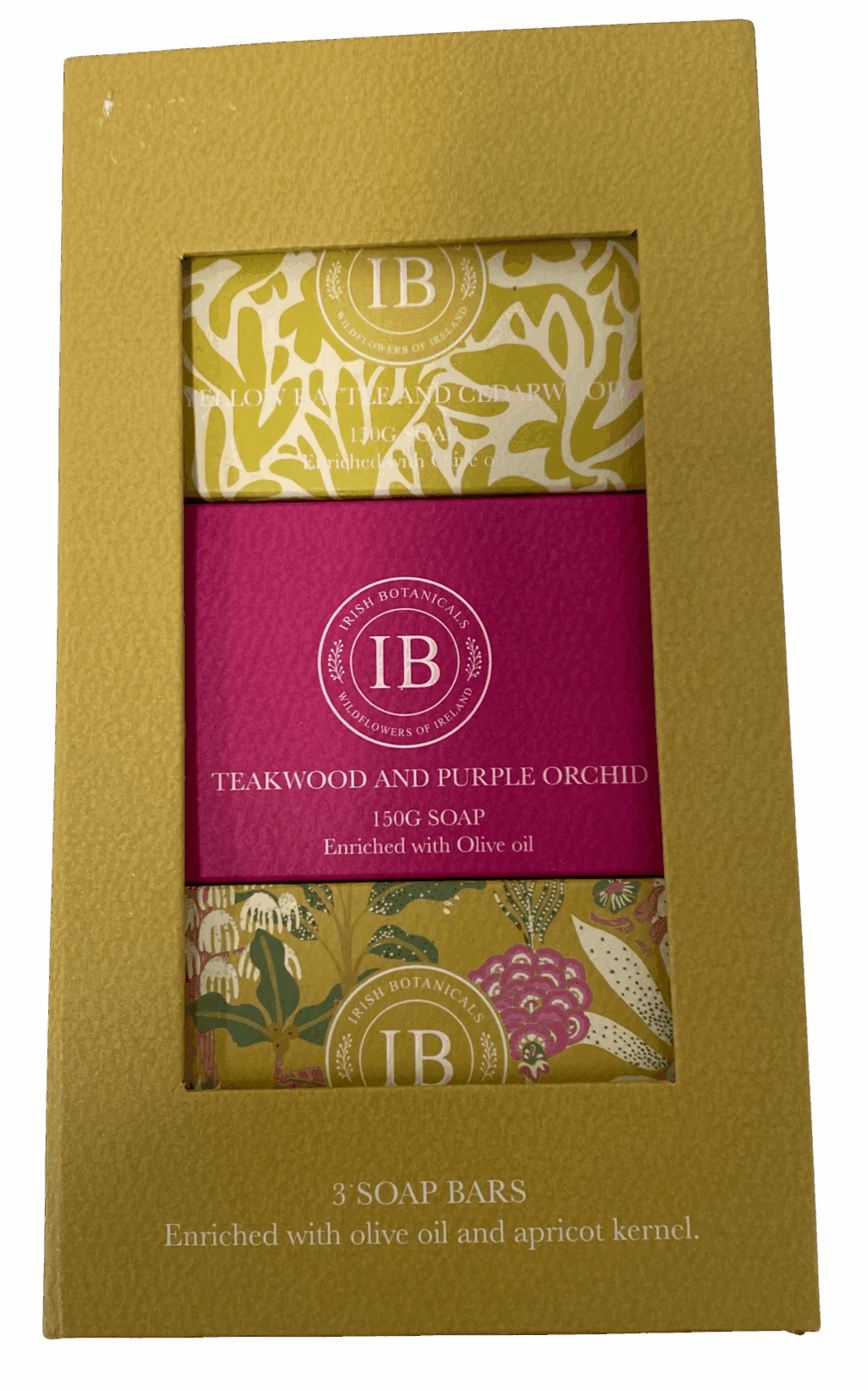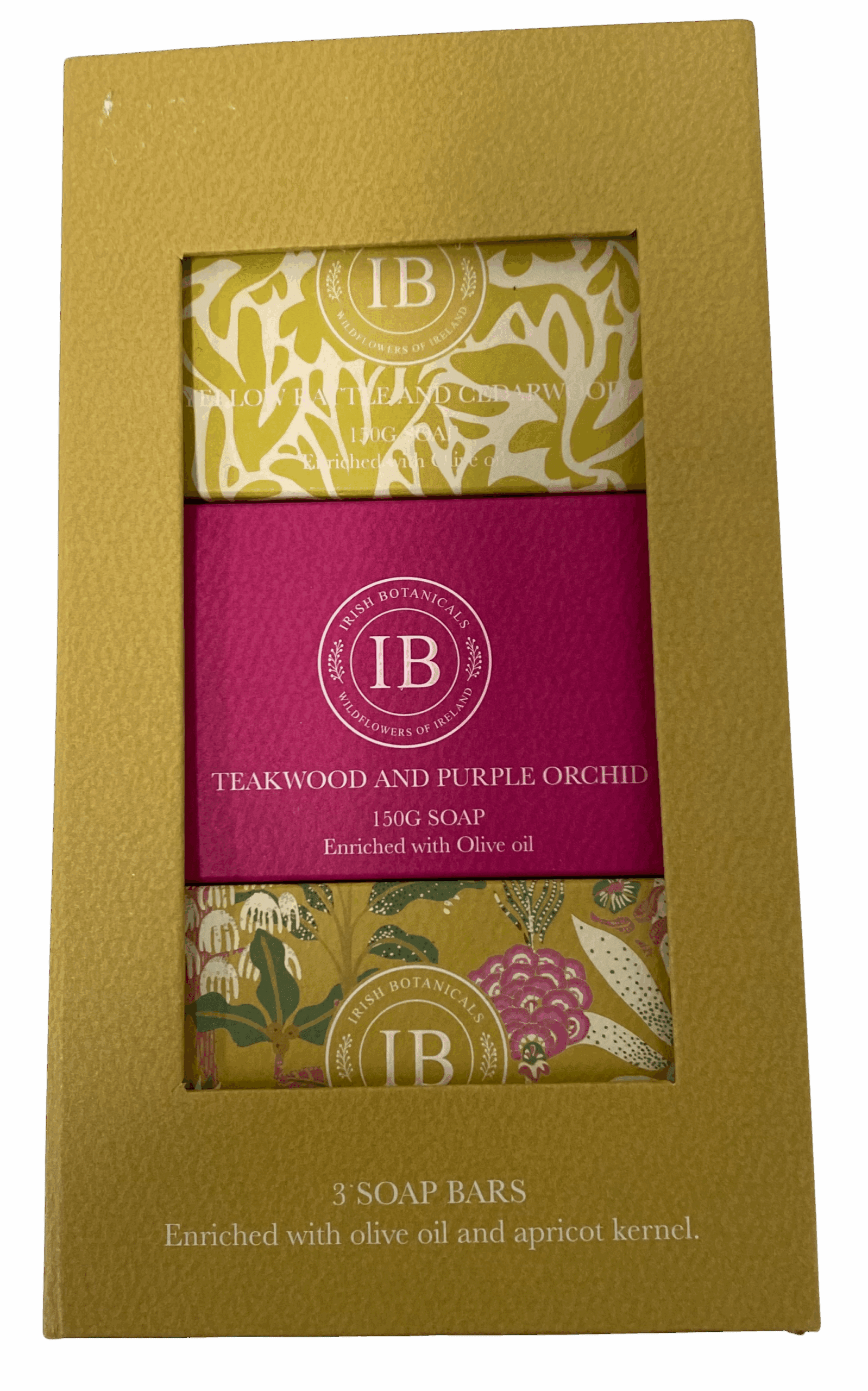 Irish Botanicals set of 3 soap bars. enriched with olive oil and apricot kernel.