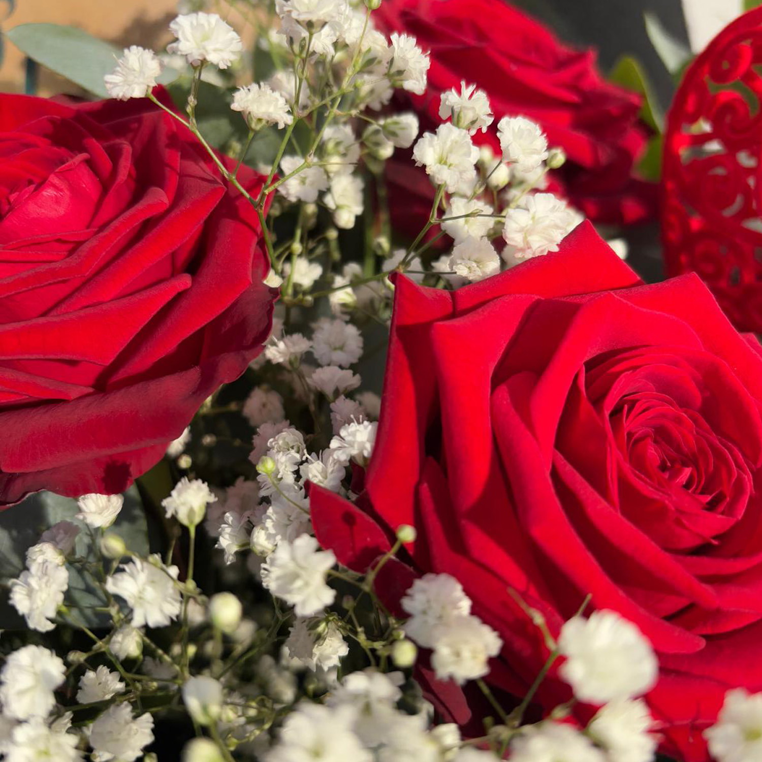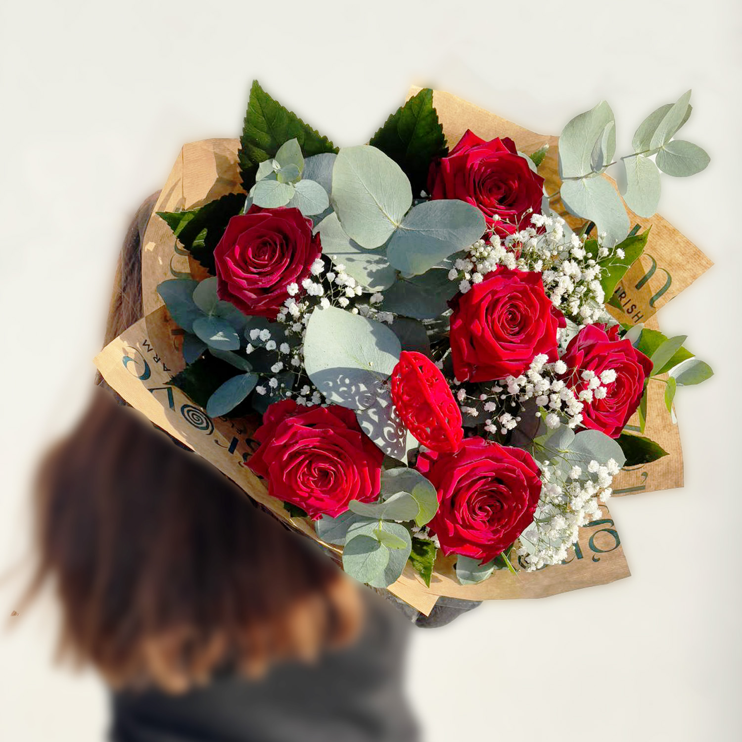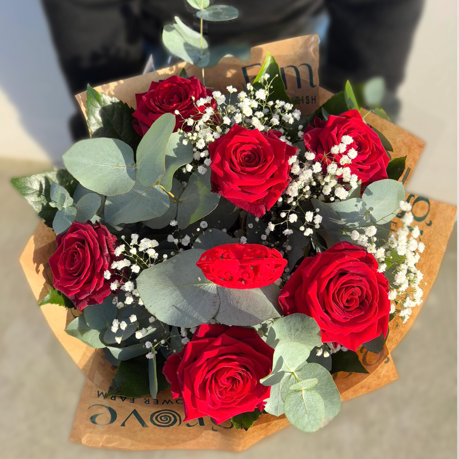 A pretty display of 6 of our grade A red roses, delicate gypsophila with an outer edging of Roebelini leaves, & our homegrown Irish foliage go in to create this romantic display. A beautiful bouquet to mark a special day. For our complete flower care instructions please refer to our flower care guide listed on our website https://elmgroveflowerfarm.ie/flower-care/