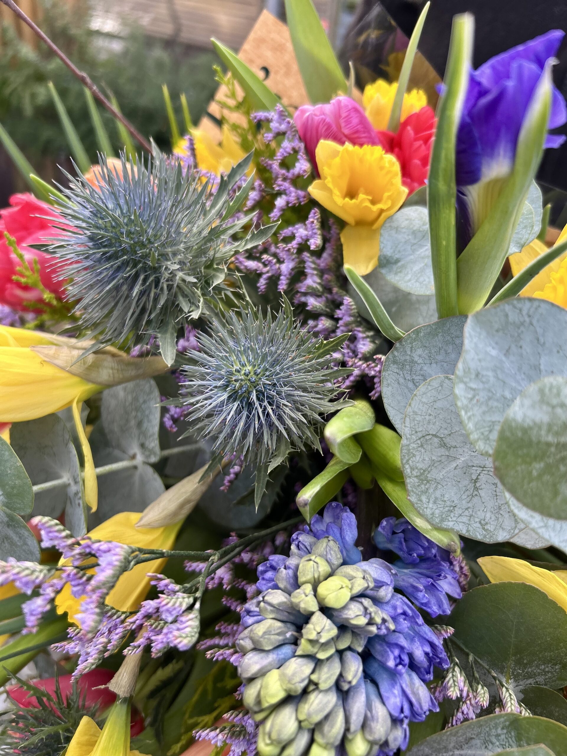 We are extremely proud to showcase our beautiful daffodils growing here on our farm. Our daffodils take centre stage in this bouquet, coupled with a spring assortment of flowers and homegrown greenery, this bouquet will truly brighten any room.